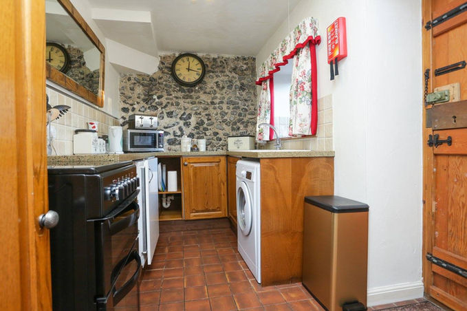 The fully fitted characterful kitchen is perfect for a short or long stay, with granite style work surfaces, a sink, electric hob, fan oven and grill, a microwave, toaster, a fridge with an icebox and a washing machine/tumble dryer.